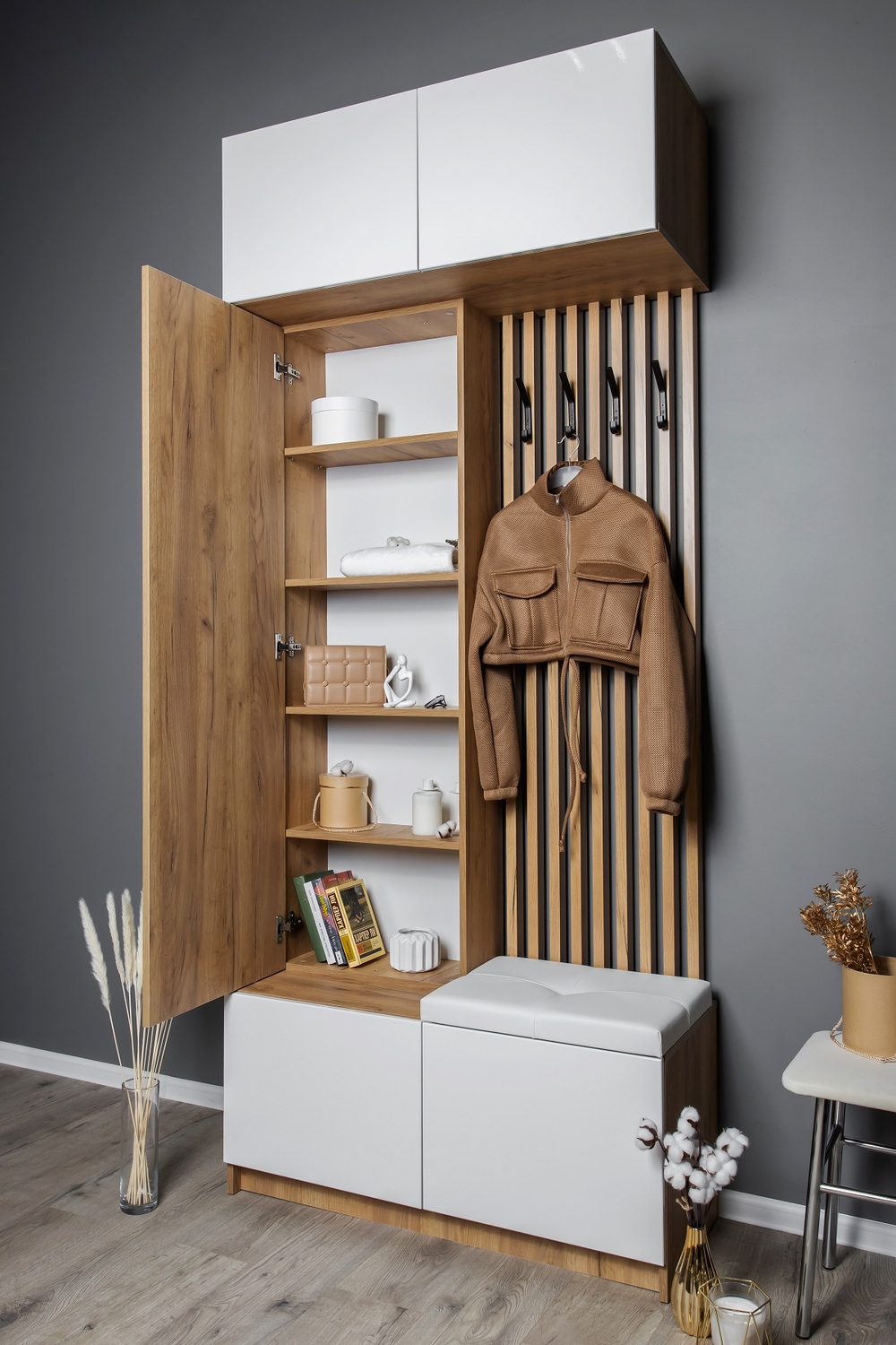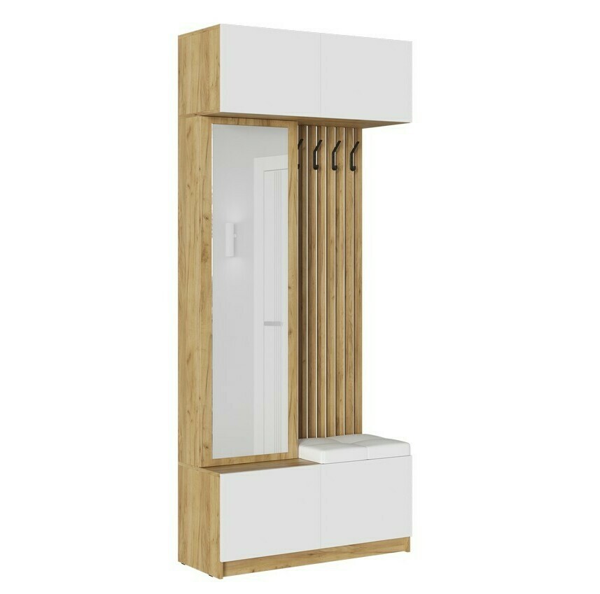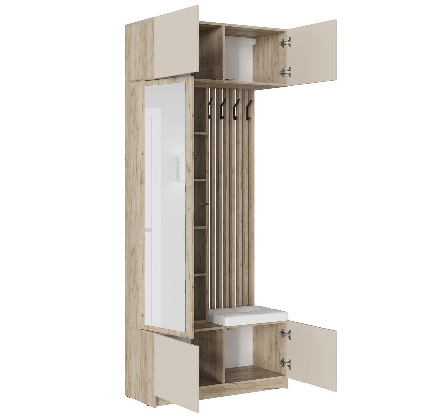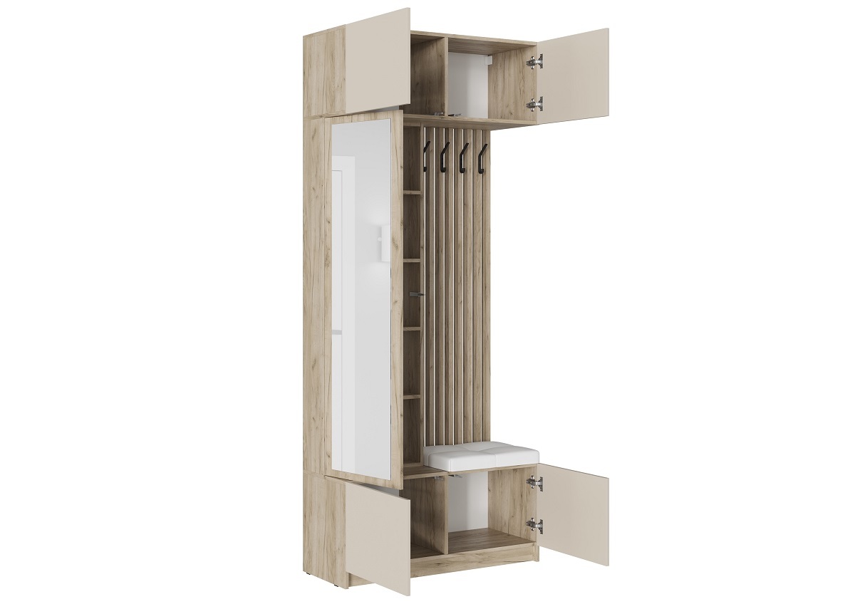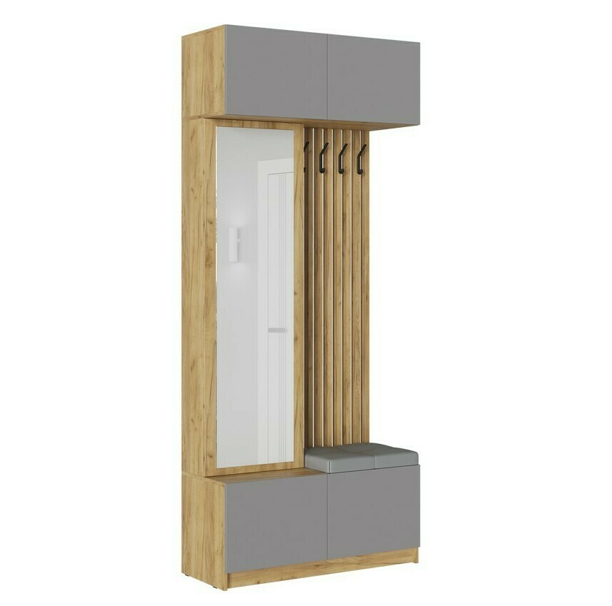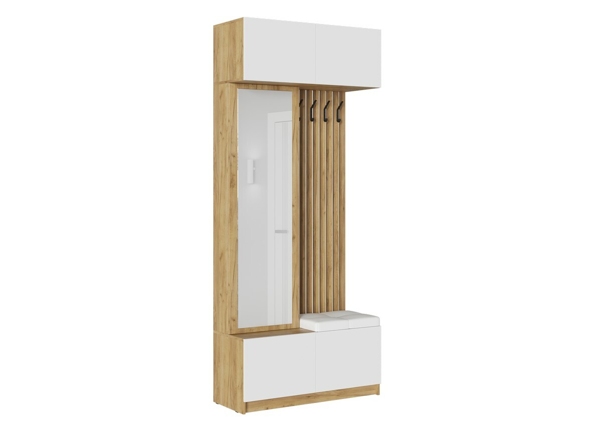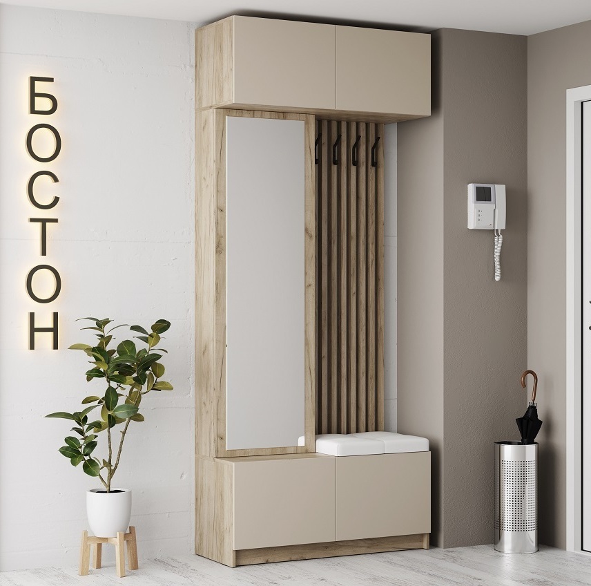 Выполненная в скандинавском стиле прихожая «Бостон» состоит из навесной антресоли, вместительной напольной тумбы, шкафа-пенала с зеркалом, а также из стильной стенки-вешалки, выполненной из профилей. Гарнитур «Бостон» - находка для небольших прихожих.