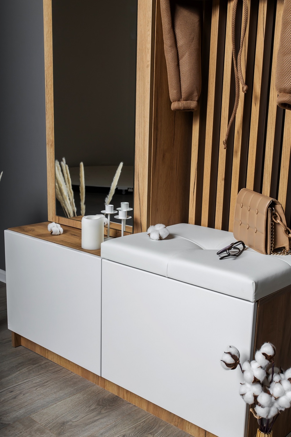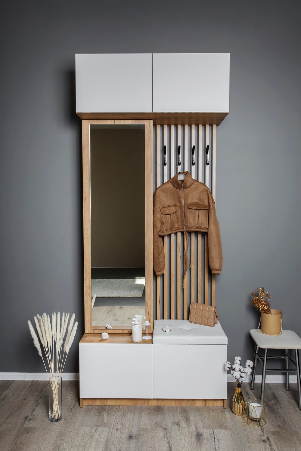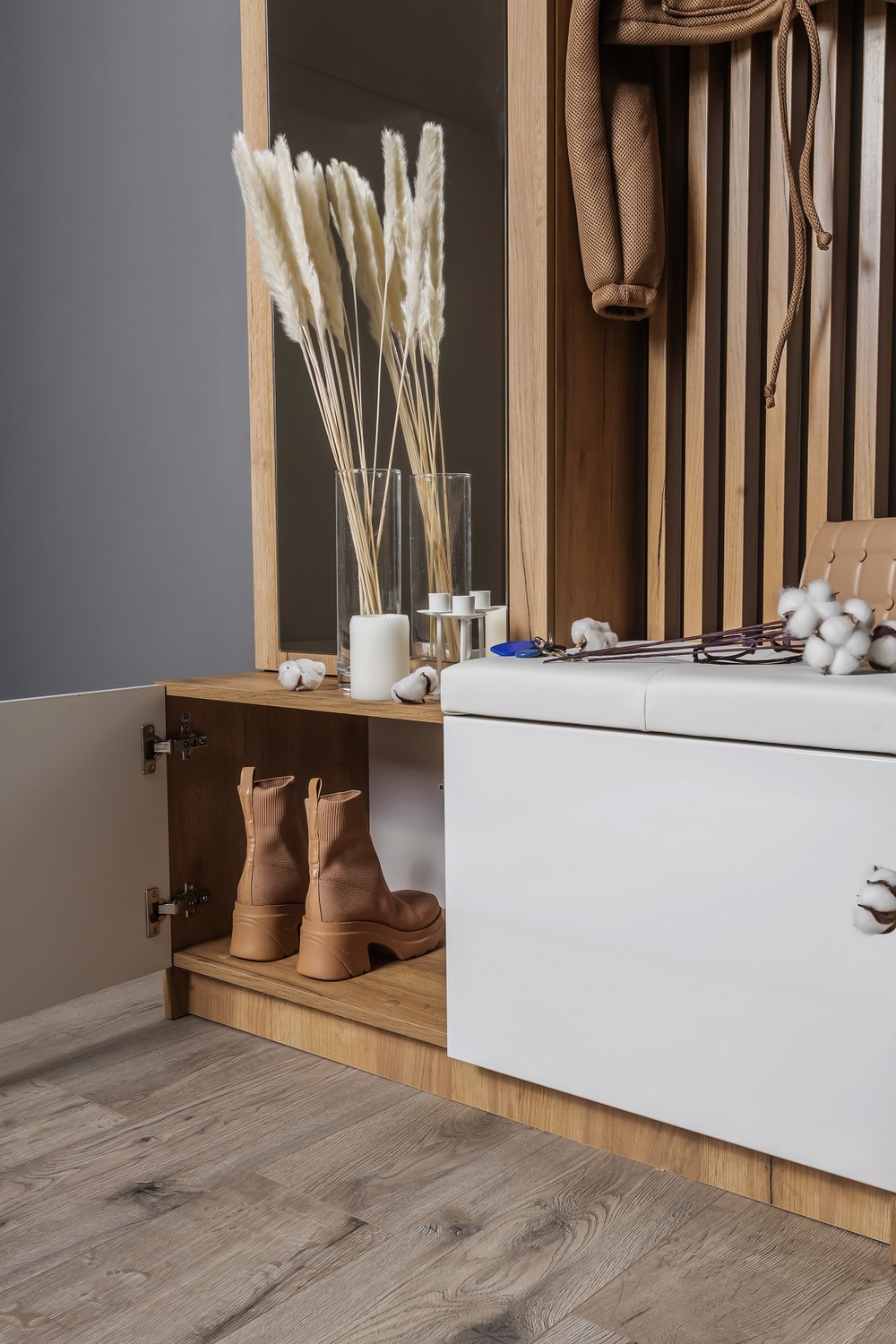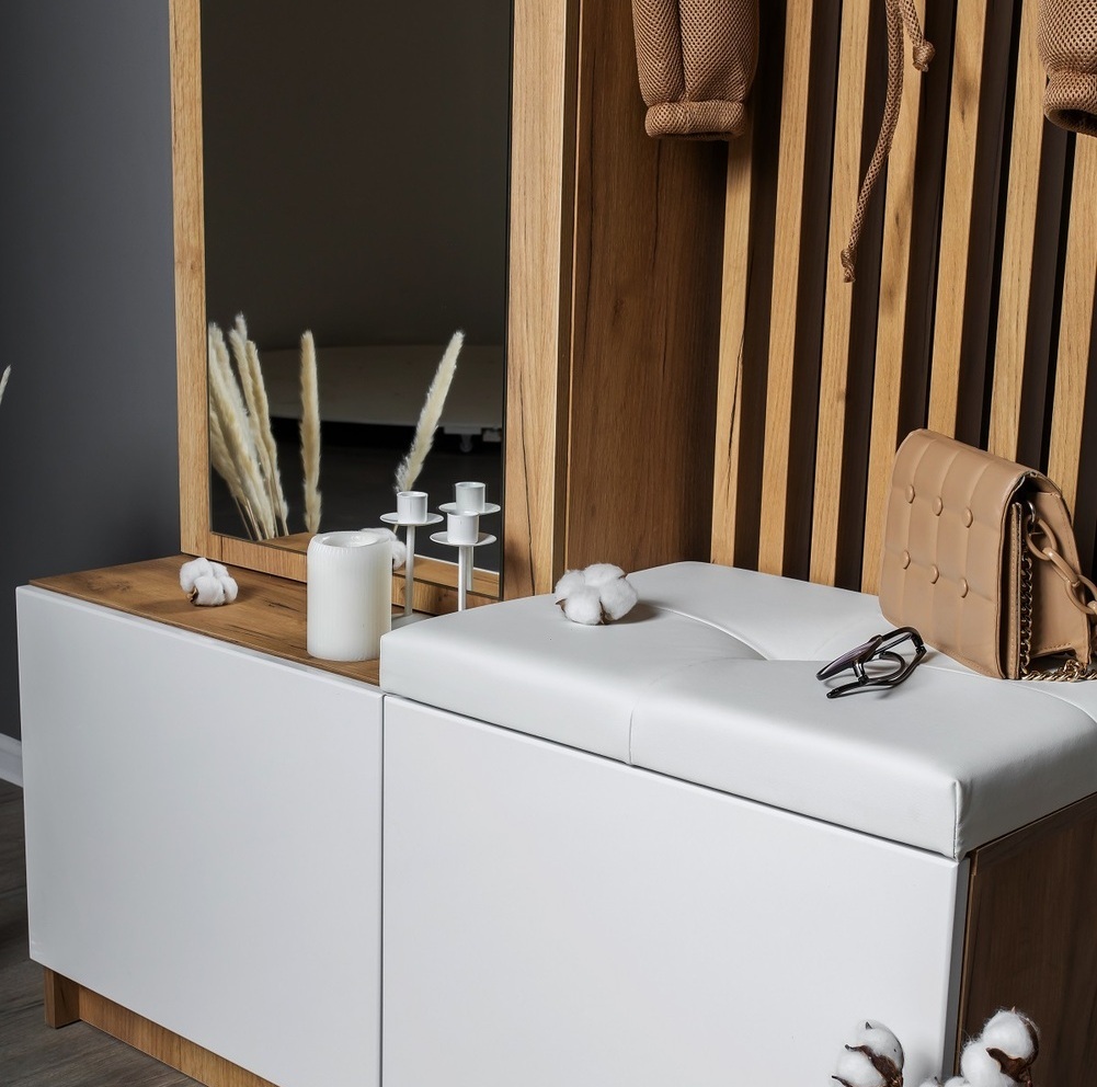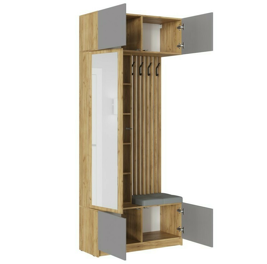 Выполненная в скандинавском стиле прихожая «Бостон» состоит из навесной антресоли, вместительной напольной тумбы, шкафа-пенала с зеркалом, а также из стильной стенки-вешалки, выполненной из профилей. Гарнитур «Бостон» - находка для небольших прихожих.