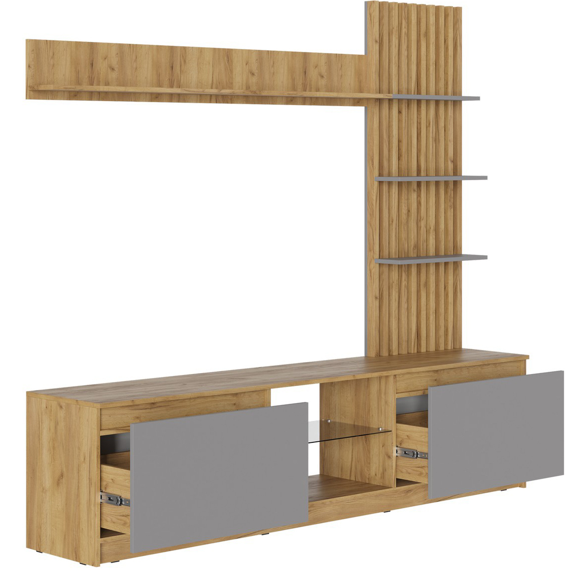 • Ниша под телевизором оборудована стеклополкой из тонированного стекла в цвете Графит, края обработаны еврокромкой