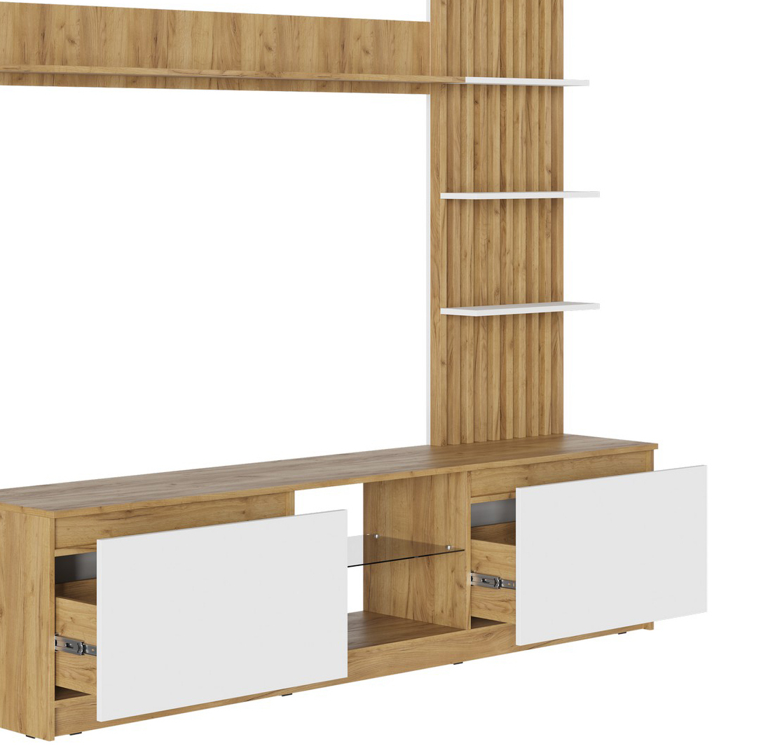 Небольшая по габаритам и элегантная стенка Бостон будет прекрасно смотреться в интерьере вашей гостиной. Функциональность в сочетании с изящным видом – главное достоинство стенки. В ее конструкции предусмотрено три открытых полки, ниша со стеклополкой, а также два объемных выдвижных ящика с повышенной грузоподьемностью.